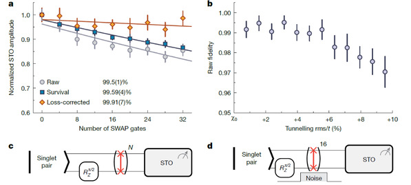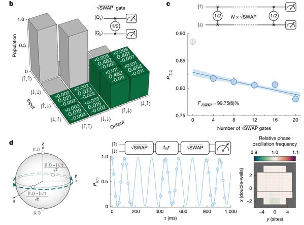 得益于帕邢-巴克物理区间中极小的差分磁偶极矩,纠缠态的相干寿命超过了10秒,这比约1.125毫秒的单次纠缠门操作时间长了整整四个数量级。基于上述成果,团队进一步开发了复合原子对交换门。该门序列通过交替使用相互作用脉冲和电荷敏感的动态倾斜,能够在完全不改变自旋态的前提下,选择性地对电荷区执行交换操作,为未来量子化学模拟中的非原生哈密顿量构建提供了关键工具。