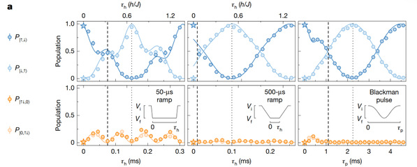 为了克服这一物理限制,该团队引入了一种准绝热的布莱克曼脉冲控制策略。在超晶格系统中,研究人员通过布莱克曼脉冲极其平滑地调节短晶格的深度,从而控制双势阱内的隧穿率。实验表明,该脉冲技术在不影响系统内在能量尺度的情况下,能够有效避免自旋自由度与电荷自由度的多余混合。实验数据显示,在操作过程中,双占态的瞬态激发率被严格压制在以下。这种方法在门操作速度与演化绝热性之间找到了极佳的平衡点。