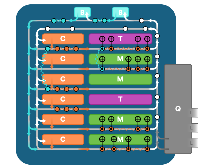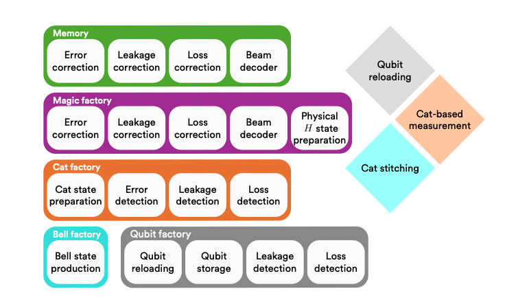 中间是逻辑架构,它定义了指令的功能,并组织执行这些指令的五种组件,分别是:存储逻辑量子比特并进行持续纠错的存储块;生成非克利福德门所需资源态的“魔法工厂”;生成逻辑测量所需“猫态”的“猫工厂”;连接芯片上各个组件的“贝尔工厂”;以及在物理量子比特丢失时处理离子替换的量子比特工厂。