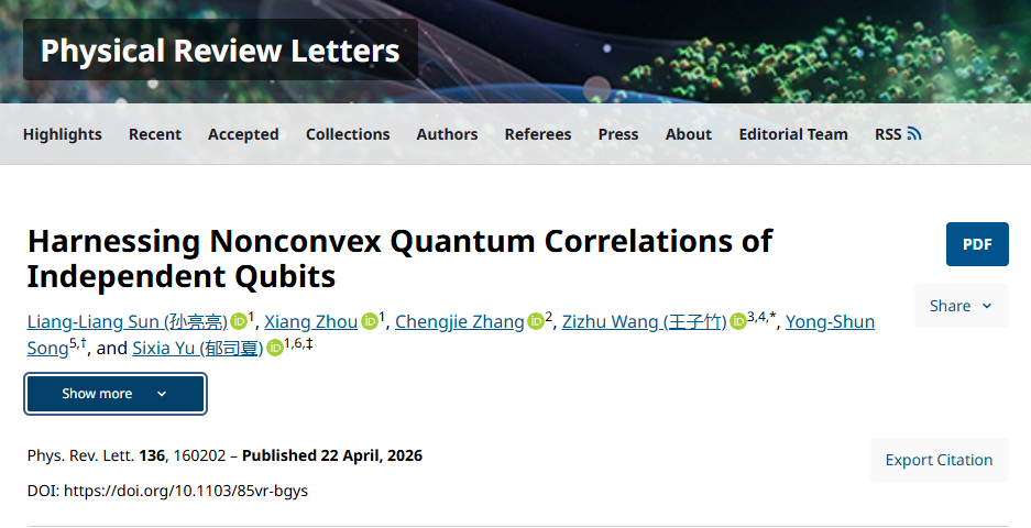 合肥国家实验室/中国科学技术大学郁司夏及其同事孙亮亮、周祥与电子科技大学王子竹、宁波大学张成杰、常州工业职业技术学院宋永顺合作,针对独立量子比特间的量子关联,发展了一种强有力的非线性分析框架,实现了对这类量子关联的非凸结构的精确刻画,并揭示了其在量子信息任务中的关键应用。该成果于2026年4月22日发表在国际权威物理学期刊《物理评论快报》(Physical Review Letters)。