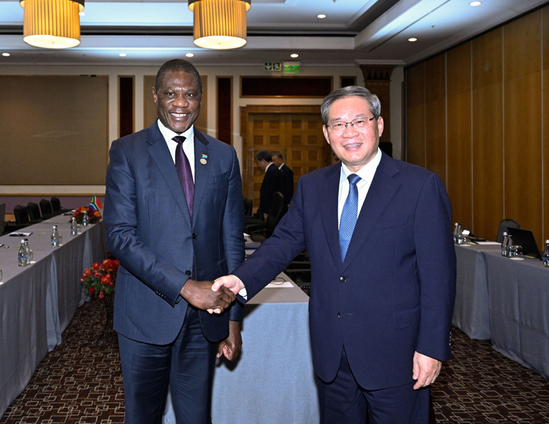当地时间11月21日,国务院总理李强在约翰内斯堡会见南非总统拉马福萨。李强首先转达习近平主席对拉马福萨总统的亲切问候,表示数十年来,中国和南非亲如兄弟,友谊跨越山海,历久弥坚。在两国元首战略引领下,中南正携手推进新时代全方位战略合作伙伴关系,致力于造福两国人民。中方愿同南非一道继续努力,弘扬传统友谊,深化政治互信,坚定支持彼此核心利益和重大关切,拓展各领域合作,更好促进两国共同发展和中非团结合作。