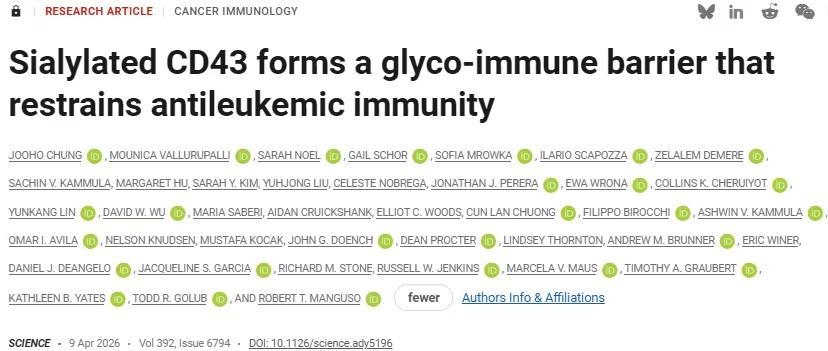 白血病擅长躲避免疫系统,使其对最新一代的许多癌症免疫疗法产生耐药性。如今,研究人员发现了这种癌症伪装的关键部分:白血病细胞表面一种名为CD43的蛋白质,被糖分子层层包裹,形成了一道物理屏障,保护细胞免受免疫攻击。 这一发现来自布罗德研究所、麻省总医院布莱根和丹娜-法伯癌症研究所的科学家,揭示了一种以前未被认识的癌症逃避免疫系统的方式,并可能指向新的免疫疗法,通过阻断CD43将癌细胞暴露于免疫攻击之
