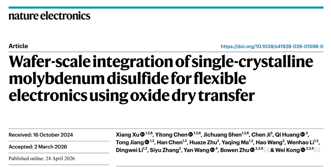 西湖大学工学院孔玮团队在二维半导体器件领域取得重要进展,提出了一种基于高介电常数氧化物的干法转移策略,实现了晶圆级单晶二硫化钼(MoS2)薄膜在柔性基底上的无损集成。该策略通过氧化物介质层增强界面结合力,实现了对单晶二硫化钼的高效机械剥离,全程避免与聚合物或溶剂的接触,从而有效解决了传统湿法转移过程中因有机残留导致的材料性能退化问题。基于这一方法制备的柔性场效应晶体管阵列展现出优异的电学性能和良好