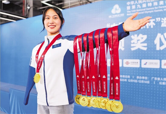 蒋裕燕在本届残特奥会游泳项目中狂揽9金。 记者 彭鹏 摄14日,本届残特奥会进入倒数第二个比赛日,田径、游泳等多个项目迎来收官。我省当日再添10金10银7铜,其中游泳4金、田径2金、盲人门球2金、坐式排球和羽毛球各1金。泳池里,“飞鱼”蒋裕燕再次登场,与队友携手摘得男女混合4×50米混合泳接力20分冠军,收获本届比赛的第九金。刘家铭在男子SM14级200米混合泳决赛中再次刷新全国纪录并夺冠。在当天