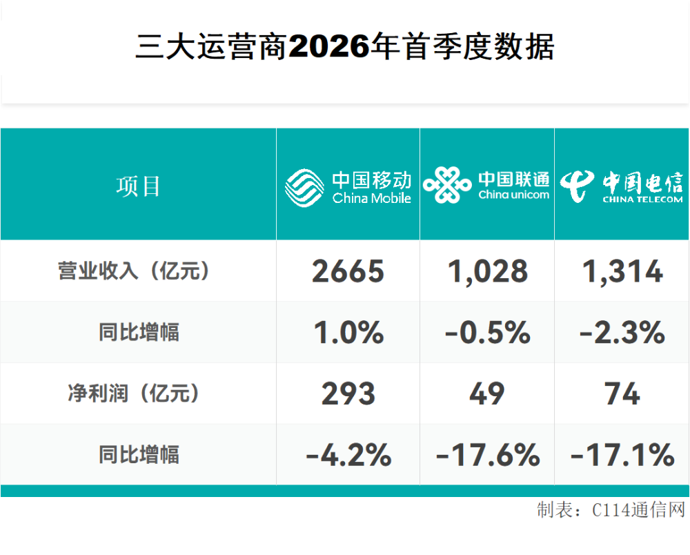 2026年第一季度,通信行业迎来了一场罕见的“倒春寒”。中国移动、中国电信、中国联通三家巨头集体交出了一份略显沉重的成绩单:净利润全面大幅下滑。其中,中国移动归母净利润同比下降4.2%,中国电信下降17.08%,中国联通下降17.6%。此外,除了中国移动勉强维持了1.0%的营收微增,联通与电信均陷入营收负增长(分别为-0.5%和-2.32%)。对于习惯了“稳健增长”的通信业而言,这种集体性的业绩承
