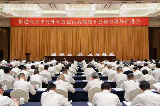 10月14日下午,推进高水平对外开放、建设高能级开放强省现场推进会在义乌召开。省委书记王浩出席会议并讲话。记者 李震宇 摄14日下午,推进高水平对外开放、建设高能级开放强省现场推进会在义乌召开。省委书记王浩出席会议并讲话,他强调,要深入贯彻落实习近平总书记关于对外开放重要论述精神和考察浙江重要讲话精神,深入践行“八八战略”,牢牢扭住高质量发展建设共同富裕示范区这一核心任务,坚持“硬件”建设和“软件