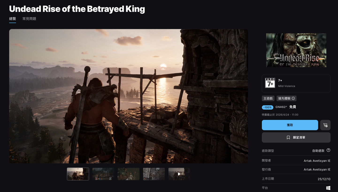 IT之家 4 月 17 日消息,开发者 Artak Avetisyan 宣布旗下黑暗奇幻动作角色扮演游戏《Undead Rise of the Betrayed King》在 Epic 游戏商城开启限时免费领取“喜加一”活动,本作在国区原价为 62 元,玩家可以在北京时间 4 月 24 日上午 10 点前将游戏加入库存。需要注意的是,本次限免并非 Epic 平台官方活动,而是由开发者自行发起的特别