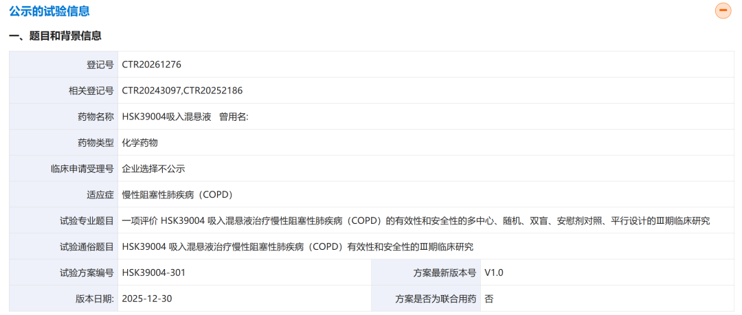 4月3日,药物临床试验登记与信息公示平台显示,海思科启动了PDE3/4抑制剂HSK39004的首个III期临床试验。该研究是一项随机、多中心、双盲、安慰剂对照临床试验(n=376),旨在评估HSK39004吸入混悬液(每日2次)治疗慢性阻塞性肺病(COPD)患者的有效性和安全性。研究的主要终点是第12周给药后的ΔFEV1AUC0-12h。HSK39004由海思科自主研发,通过同时抑制PDE3和PD