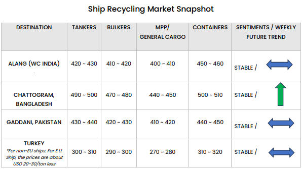Alang, India 印度 本周,印度Alang拆船市场展现出一定韧性。尽管经济形势复杂多变,当地拆船企业对收购新船运力仍保持稳定兴趣。当前钢价走弱持续压制市场整体情绪,但印度卢比的强势反弹为行业带来显著提振。在印度储备银行的政策性干预下,卢比从历史低位回升至 1 美元兑 92.73 卢比,有效降低了船舶收购成本,改善了本土买家的财务预期。本周国内废船价格整体持稳,需求小幅回暖为船价提供了一定