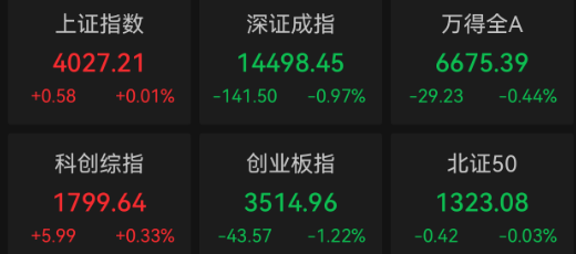 2026.04.15本文字数:446,阅读时长大约1分钟作者 | 一财阿驴4月15日,四大股指收盘涨跌不一,上证指数报收4027.21点,涨0.01%,深成指报收14498.45点,跌0.97%,创业板指报收3514.96点,跌1.22%,科创综指报收1799.64点,涨0.33%。盘面上,医药板块全天强势,电网设备、旅游、银行板块活跃,油气、电池、房地产板块走弱。具体来看,医药股全天强势,博瑞医