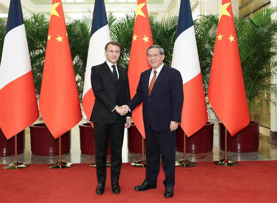 12月4日下午,国务院总理李强在北京人民大会堂会见来华进行国事访问的法国总统马克龙。李强表示,近年来,在两国元首战略引领下,中法关系与合作取得很多新的进展和成果。今天上午,习近平主席同总统先生举行会晤,为进一步深化两国关系指明了方向。中法同为全球主要经济体和联合国安理会常任理事国,保持密切战略沟通,开展协调有力行动,不仅有利于双方携手发展,也能为当今变乱交织的世界注入更多稳定性、确定性。中方愿同法