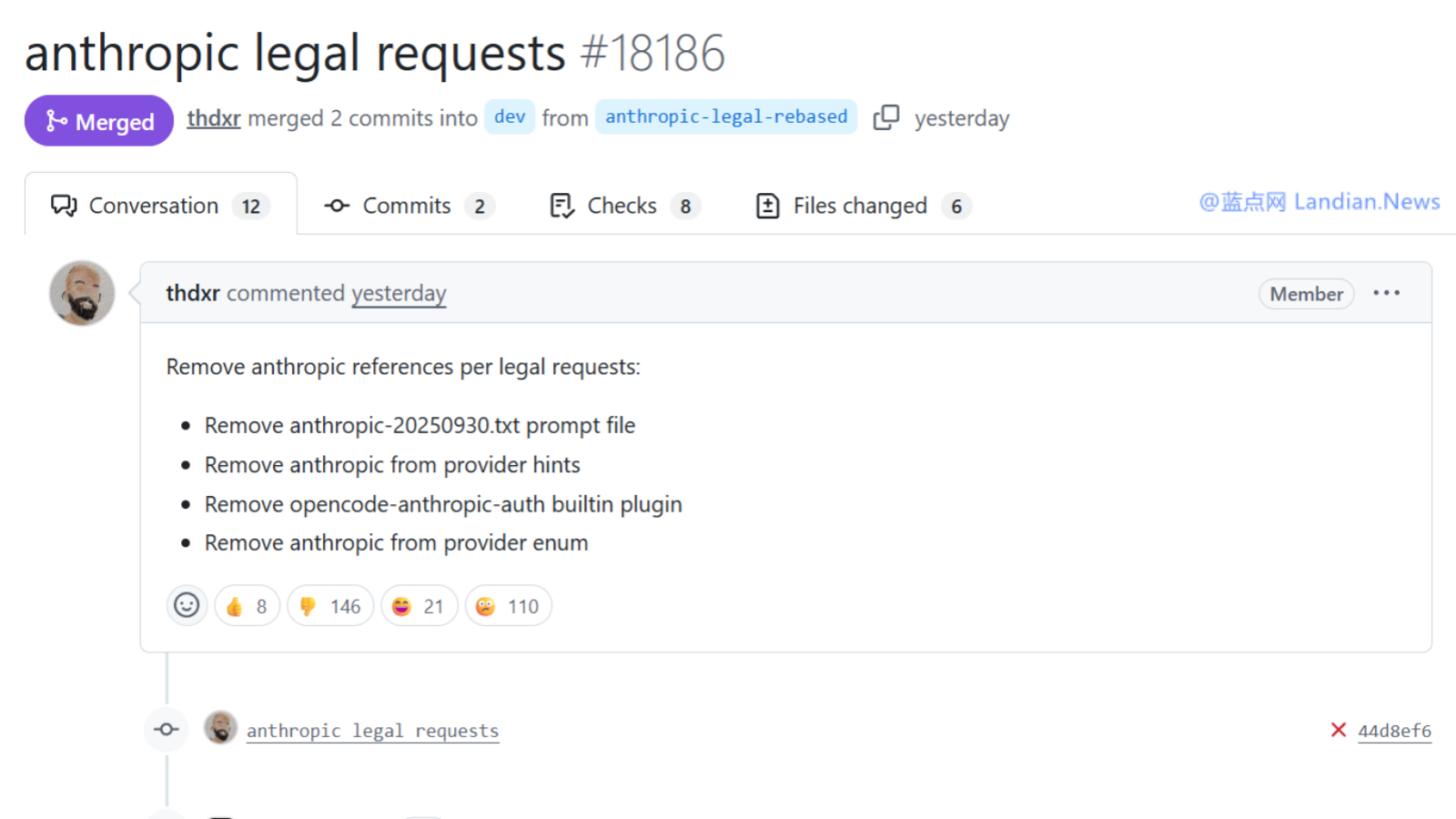 #人工智能 开源 AI 编码工具 OpenCode 遭到 Anthropic 法律投诉,要求移除所有与 Anthropic/Claude 相关的引用。基于法律原因,OpenCode 目前已经彻底删除 Claude 相关内置的提示词、认证插件、模型提供商清单、请求头等,但用户仍然可以通过其他插件恢复 Claude 的使用。查看全文:https://ourl.co/112251此前人工智能开发商 An