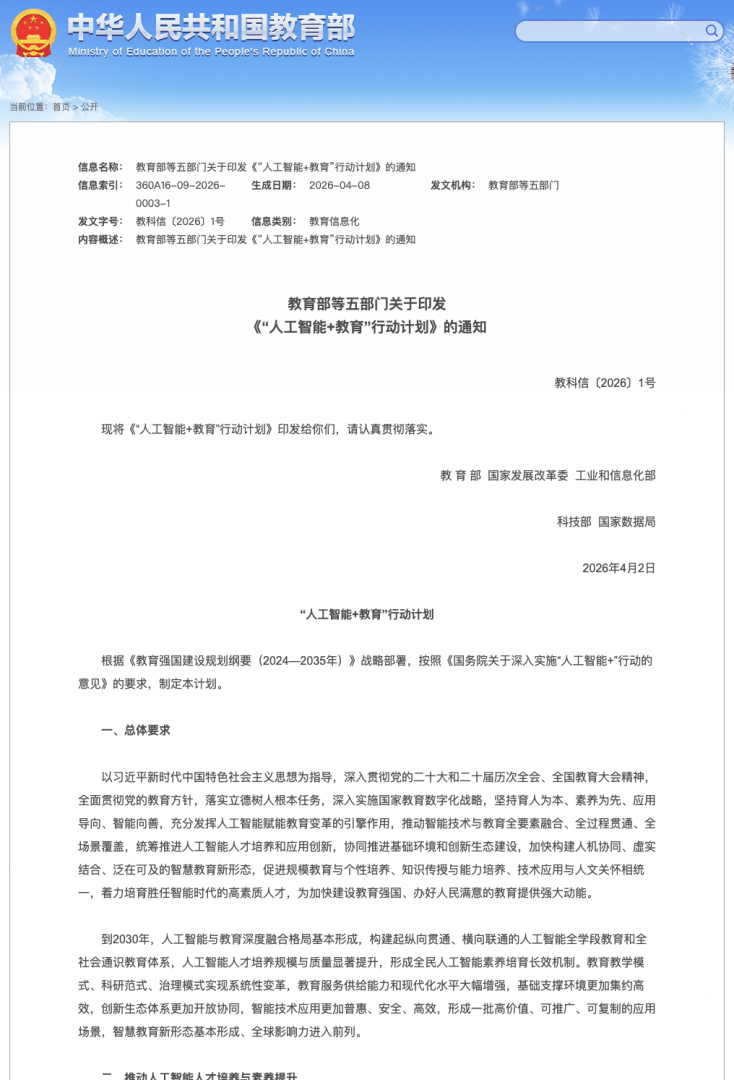 【TechWeb】4月13日消息,近日,教育部、国家发展改革委、工业和信息化部、科技部、国家数据局联合印发《“人工智能+教育”行动计划》(以下简称《行动计划》),旨在一体推进人工智能人才培养和应用创新,统筹谋划基础环境和创新生态建设,系统构建智能时代的教育体系。《行动计划》指出,到2030年,人工智能与教育深度融合格局基本形成,构建起纵向贯通、横向联通的人工智能全学段教育和全社会通识教育体系,人工