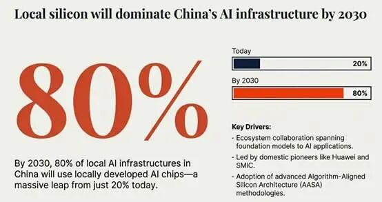 随着地缘政治紧张局势持续加剧,以及人工智能技术的飞速迭代,中国企业在AI领域的布局正迎来关键转折点。Gartner近日发布最新预测指出,到2030年,中国80%的本地AI基础设施将采用本土研发的AI芯片,而目前这一比例仅为20%。与此同时,AI安全、数据合规与自主运营等领域的增长空间同样不容小觑,将成为企业未来竞争的焦点。国产芯片突围:从20%到80%的跨越Gartner研究总监金玮表示,美国政府