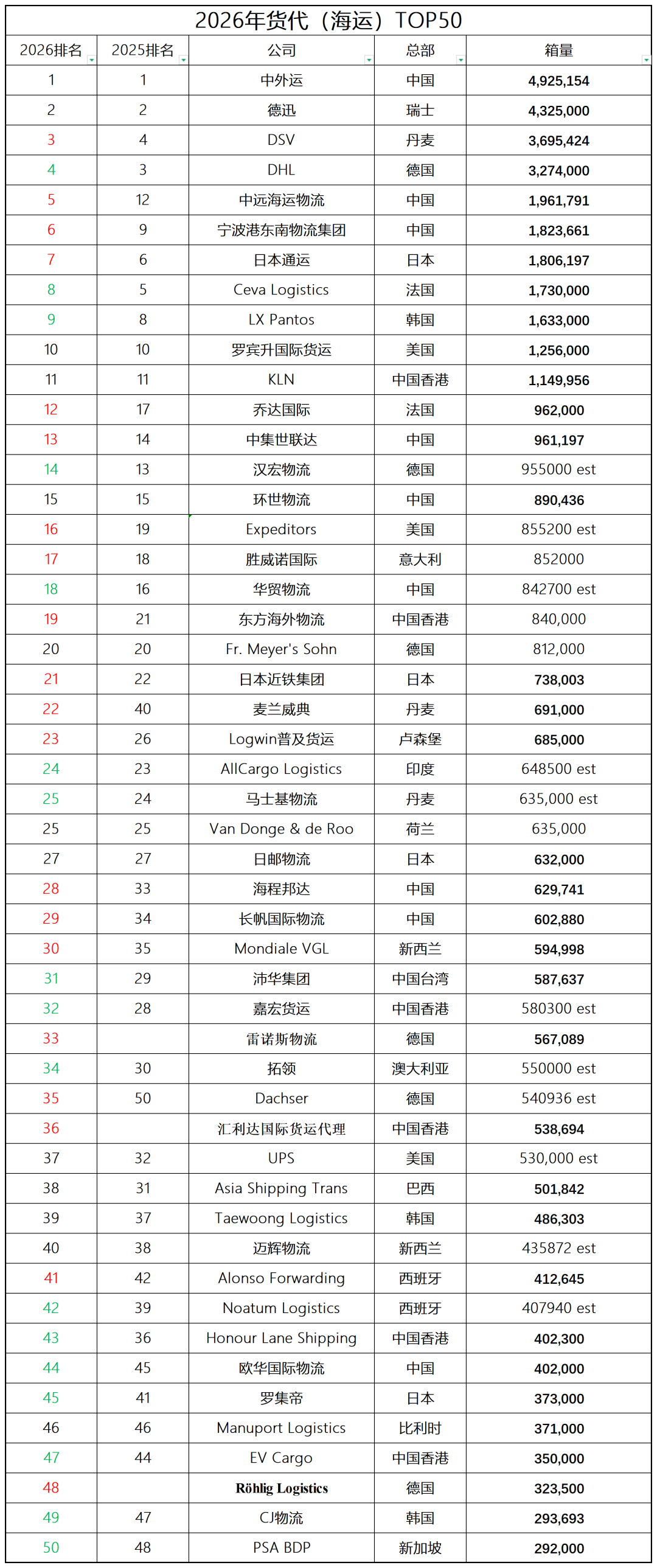 航运界网消息,根据全球物流业权威杂志《Transport Topics》2026年全球海运/空运货代50强榜单,中国外运股份有限公司(以下简称“中外运”)蝉联全球货代(海运)TOP50榜首,在全球货代(空运)TOP50全球中位列第6,亚洲第一。具体而言,根据《Transport Topics》数据,在全球货代(海运)TOP50中,中外运以492万TEU的箱量蝉联榜首,德迅集团以432万TEU的箱量