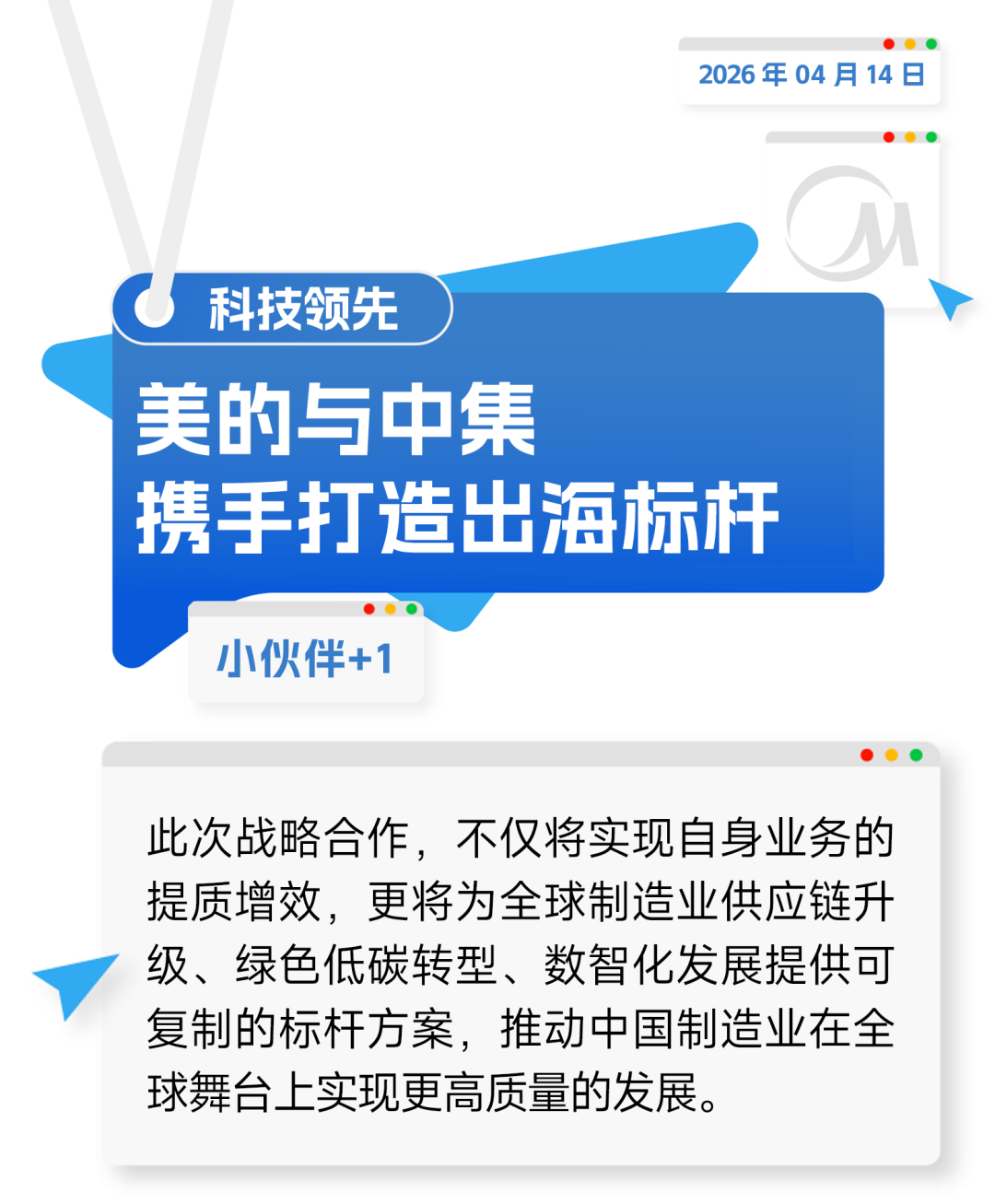 4月13日,美的集团与中国国际海运集装箱(集团)股份有限公司(以下简称“中集集团”)正式签署全面战略合作协议。双方将在智慧建筑、绿色循环包装、新能源、数字化与智能产线升级、物流服务、钢材加工及供应等领域深化协同,携手打造跨行业协同发展的全新标杆。中集集团副总裁李胤辉与美的集团企业业务总裁王新亮代表双方签约,中集集团董事长麦伯良、总裁高翔、副总裁王小岩、总裁助理单立坡,美的集团董事长兼总裁方洪波、美