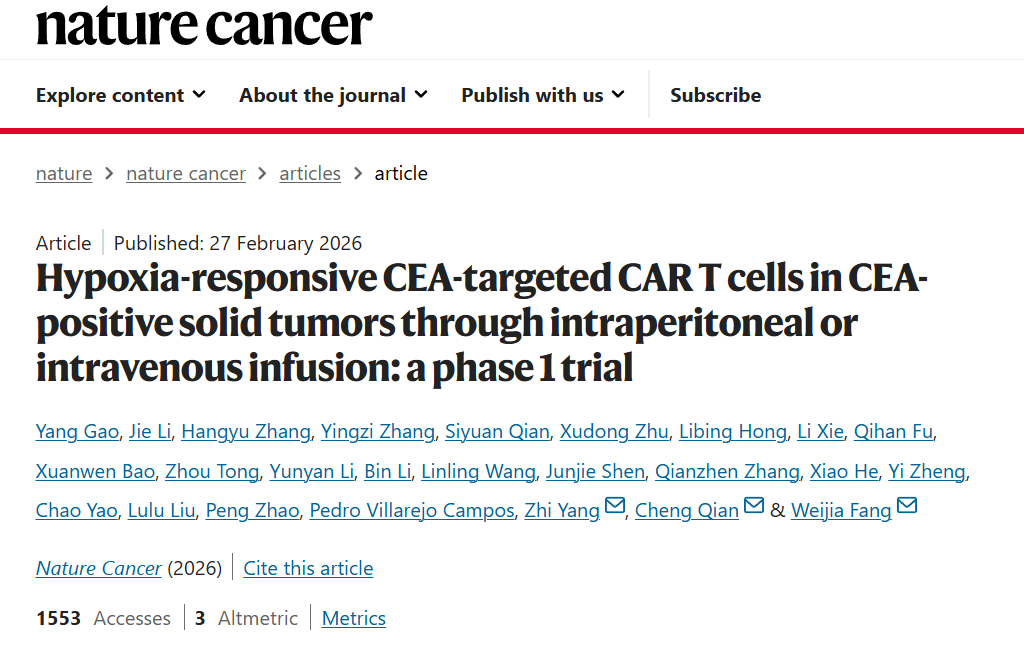 编者按我们常听说CAR-T细胞疗法是“抗癌神药”,能精准猎杀癌细胞,但它至今主要用于白血病、淋巴瘤等血液肿瘤,面对肺癌、肠癌、胃癌等占癌症绝大多数的实体瘤,却屡屡碰壁。近期,一项发表在国际顶级期刊《自然・癌症》(Nature Cancer)上的中国研究传来重大突破:全球首款缺氧响应型CAR-T细胞疗法PC13,在晚期实体瘤患者中展现出可控的安全性和令人鼓舞的疗效,为无数多线治疗失败的患者点亮了新的