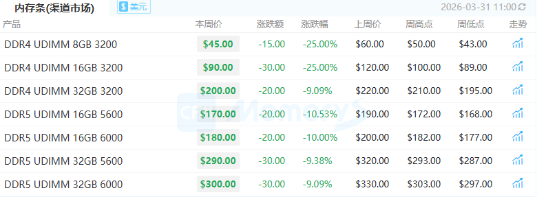 半导体行业圈 振兴国产半导体产业!4月2日,据报道,在短短一周多的时间内,内存条市场经历了剧烈的价格跳水。以DDR5为代表的内存条近日持续降价,部分产品降幅达到30%!据悉,从上周开始,内存市场价格出现了显著回落。据深圳华强北电子市场的商户透露,多款主流内存产品价格直线下跌。目前,16G内存已从上周的900元高位降至目前的700元左右。而32G规格的内存产品降幅更为惊人,普遍下调了约300元,部分