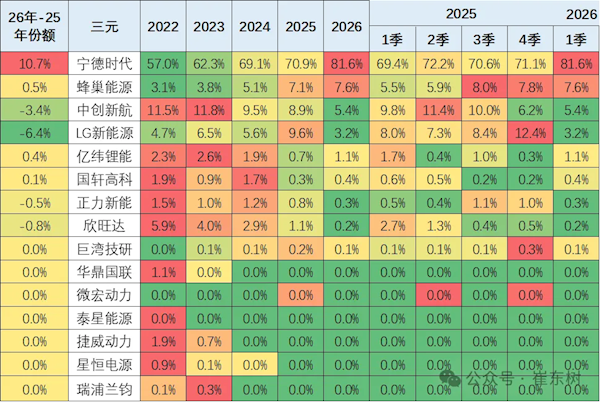 快科技4月14日消息,最新动力电池市场数据显示,宁德时代在三元锂电池领域的份额大幅提升,占比已经超过81%,创下历史新高。2026年3月,国内动力电池产量达到178GWh,同比增长32%,一季度累计产量487GWh,同比增长26%。不过动力电池装车率明显走低,3月装车率只有32%,处于历史低位。随着高端新能源车型需求回升,三元电池的市场表现明显走强。宁德时代在三元电池赛道优势突出,市占率高达81.
