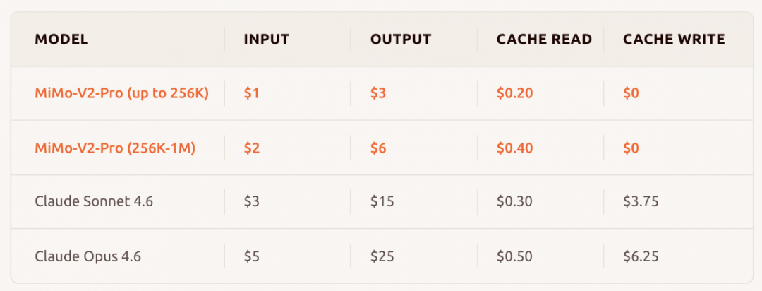 API调用定价策略上,小米展现出极高的诚意:MiMo-V2-Pro的API定价仅为Claude Opus 4.6的五分之一,输入每百万tokens最低仅需1美元。