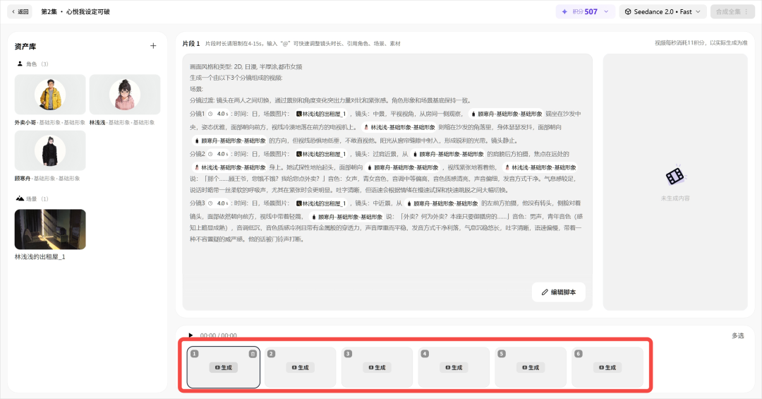 等到一集分镜脚本干完之后,你就可以点进这一集,查看分镜脚本有没有问题,没问题的话,再点击下面每一场的生成按钮,就OK了。