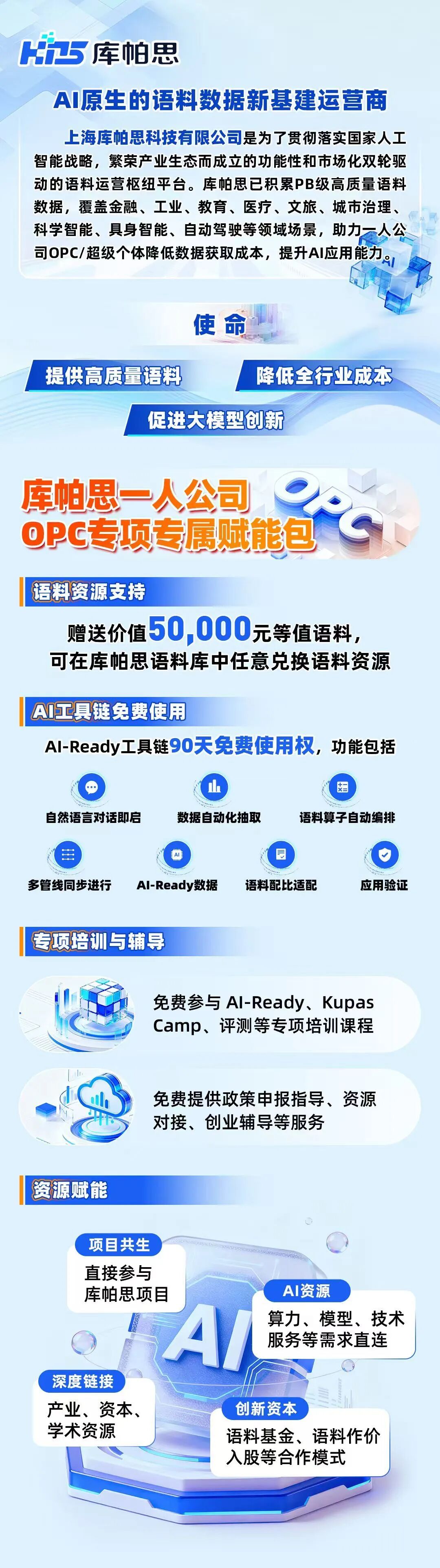 库帕思本身也为OPC们定制了专项扶持计划,以轻量化、高价值的资源组合,助力个人与小微团队快速跨入AI实战门槛。除了像50,000元的等值语料、AI-Ready工具链、KupasCamp、评测等语料、工具、培训层面的扶持之外,还有资源的赋能,通过项目共生机制,OPC团队直接参与库帕思项目,为OPC开辟从技术到场景的落地,还有如语料作价入股等创新基金的合作模式,为项目成长注入资本动能。详细可以参考:https://www.kupasai.com/opcView