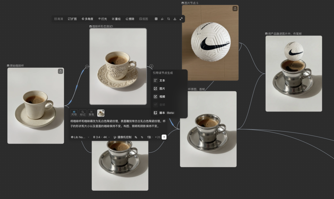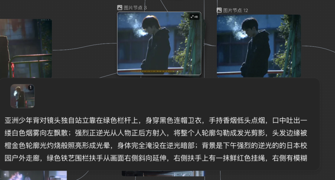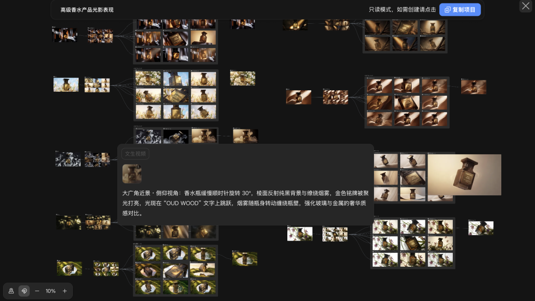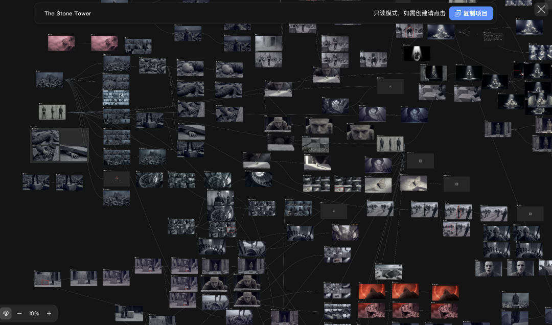 角色设定、场景草图、视频片段可以被并排摆放,整个项目的结构是全局可见的,创作者可以自由且动态地连接不同的处理环节,也能随时单点删除不满意的分支。
