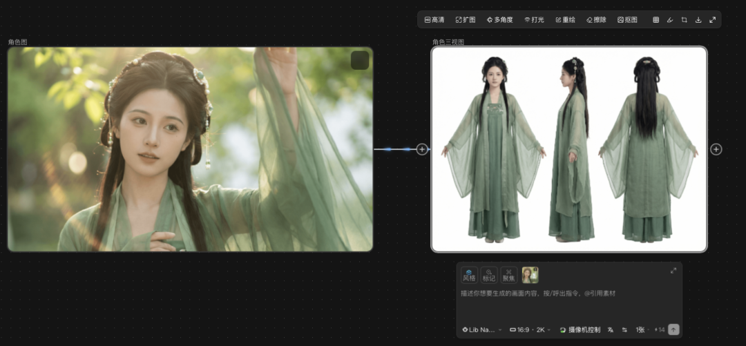 为了彻底解决长视频叙事中的人物一致性问题,LibTV 引入了角色三视图生成功能。
