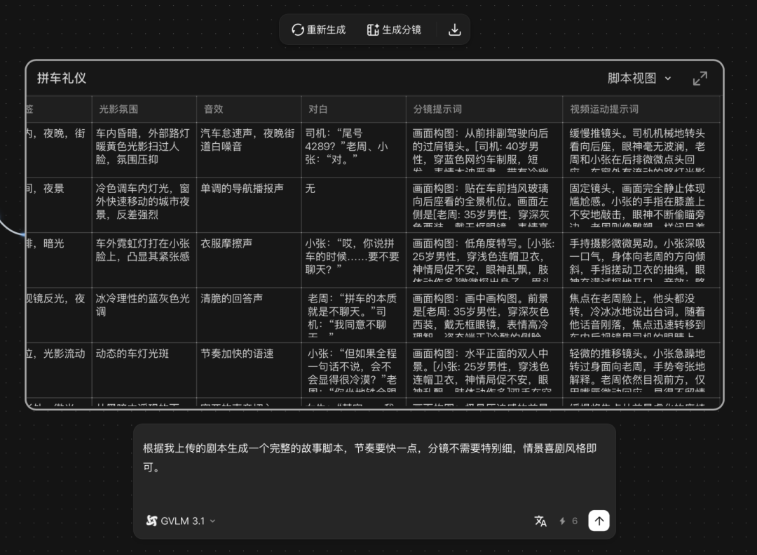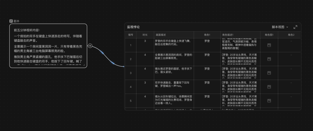 用户还能直观地看到镜头之间如何衔接,节奏如何推进,并且可以修改每一个表格。