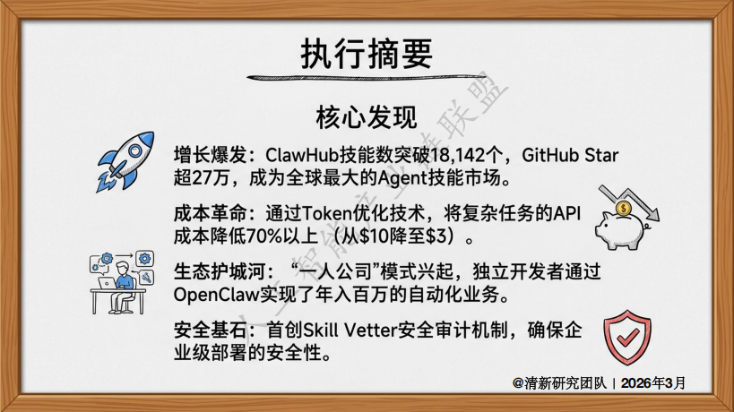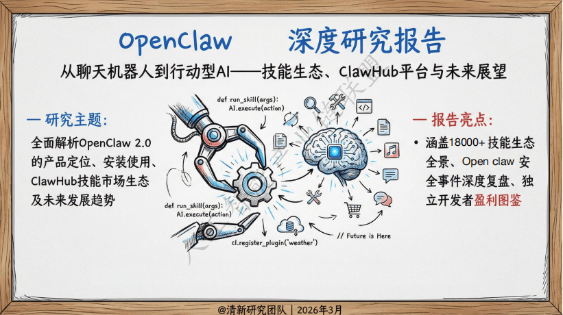 清华大学清新研究团队发布重磅报告,全面解析OpenClaw的产品定位、ClawHub技能生态及未来趋势。18000+技能、27万GitHub星标、成本降低70%……这个开源项目正在重新定义人工智能的边界。