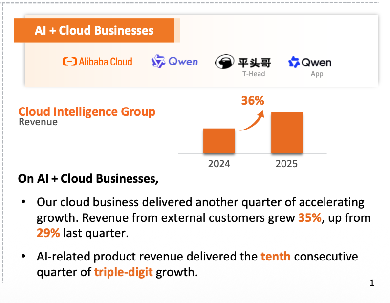 这组数字是好消息。36% 的增速虽然没有达到高盛预测的 38%,但差距很小,且延续了连续三个季度的加速趋势,从 26% 到 34% 再到 36%。高盛将阿里上调为 Conviction Buy 的核心假设(云增速站上 30%)得到了验证。