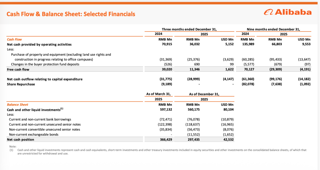 这组数字直接回答了“钱花在哪”的问题:AI 基础设施和闪购补贴两头烧钱,经营现金流被大幅压缩,自由现金流九个月累计转负近 300 亿。资产负债表上,截至 12 月 31 日净现金头寸从年初的 3664 亿元降至 2974 亿元,九个月减少了约 690 亿。阿里仍然有充足的现金储备,但消耗速度在加快。