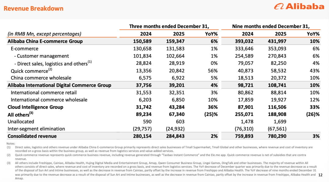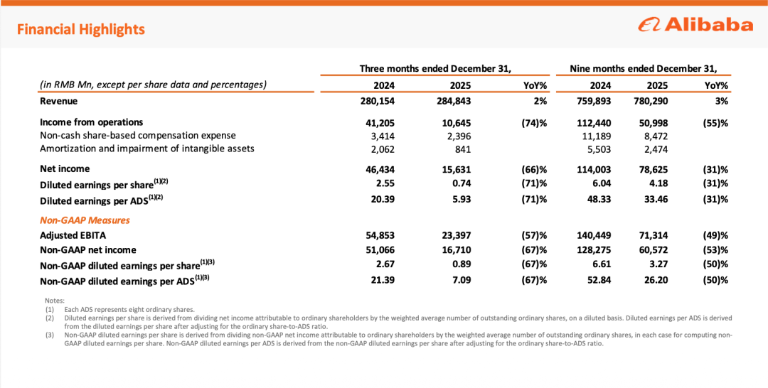 3 月 19 日,阿里巴巴发布 2026 财年第三季度业绩(截至 2025 年 12 月 31 日)。本季度阿里集团营收2848.4亿元人民币,同比增长2%;剔除已出售的高鑫零售和银泰业务,同口径收入同比增长9%。净利润 156.3亿元,同比下滑66%。Non-GAAP净利润167.1 亿元,同比下滑67%。经调整EBITA为234亿元,同比下滑 57%。