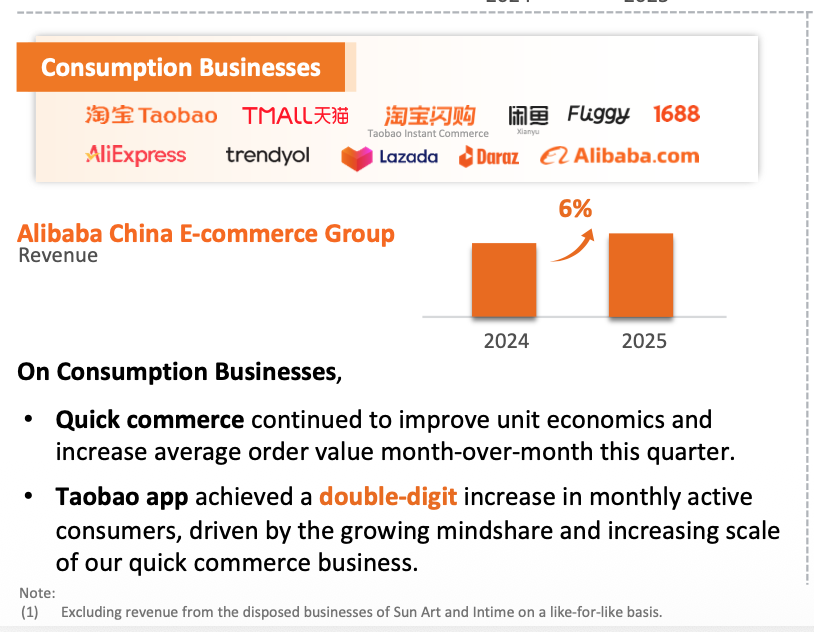 CMR 增速从 10% 骤降至 1% 是这份财报中最值得警惕的数据之一。它意味着淘天电商的核心变现能力,商家在平台上的广告和佣金支出,基本停止增长。88VIP 会员突破 5900 万,同比双位数增长;淘宝 App 月活消费者同比双位数增长,但用户增长没有转化为收入增长,说明单用户变现效率在下降,或者闪购带来的新增用户消费贡献很低。