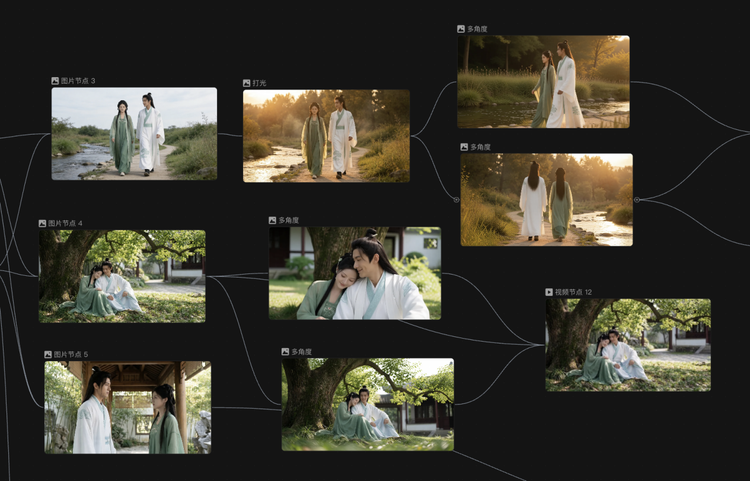 接下来,进入具体的场景图创作,我们设置了河边、树下、亭子里三种场景,LibTV支持多个节点同时生成,可以减少等待时间。