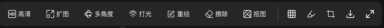 针对当前的图片,工具大体分两类。一类是在原图上做精细控制,比如高清、扩图、重绘、擦除、抠图等等,其中最值得一提的是打光和多角度。