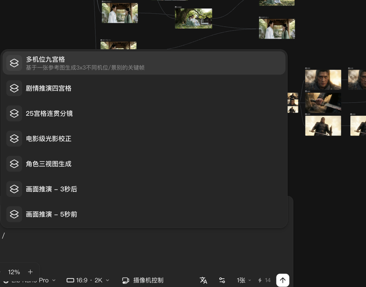 这些工具更多是从这张图出发,向外延伸出叙事接下来可以走的路,比如刚刚的多角度,在这里可以用“多机位九宫格”,让模型自己分配、一口气生成九个机位和景别的关键帧。