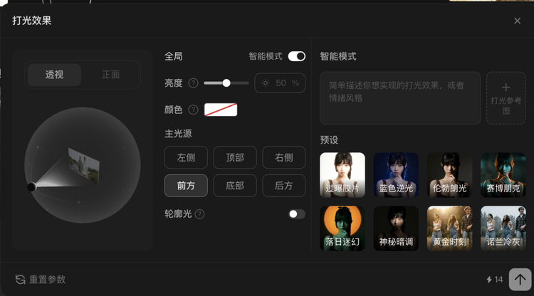 打光工具中,你可以选择智能模式,输入自然语言让模型自己理解,也可以手动操作三维坐标球,控制光从哪个角度打来、亮度是多少、颜色是怎样的,0 Prompt门槛。