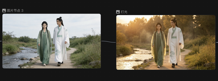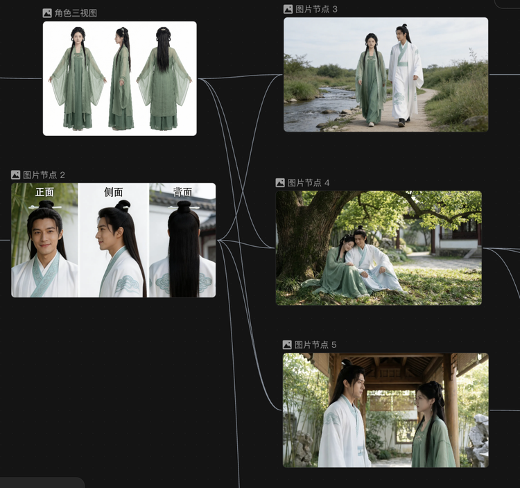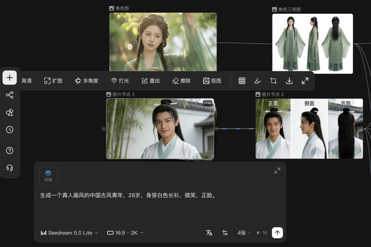 首先,在人+精细化工具这一路径下,我们先创建了图片节点,生成了两个古风人物,然后选择“角色三视图”功能,让后续角色在变化动作和角度时,能够更加稳定准确。