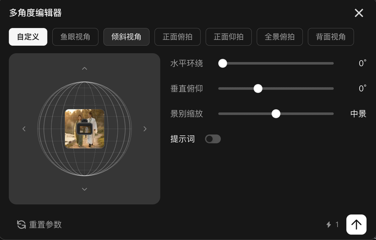 用户可以手动拖拽角度球,也可以用提示词,或者拉杆设置角度。左侧、俯视、仰视、背面,你选好点位,AI直接出图。