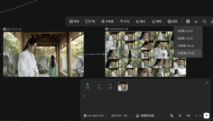 还有剧情推演四宫格,一次生成4个不同的剧情走向;25宫格连贯分镜,一次出25帧,生成出来的多宫格图像,可以用图像工具栏里的宫格切分功能,直接送进新节点。