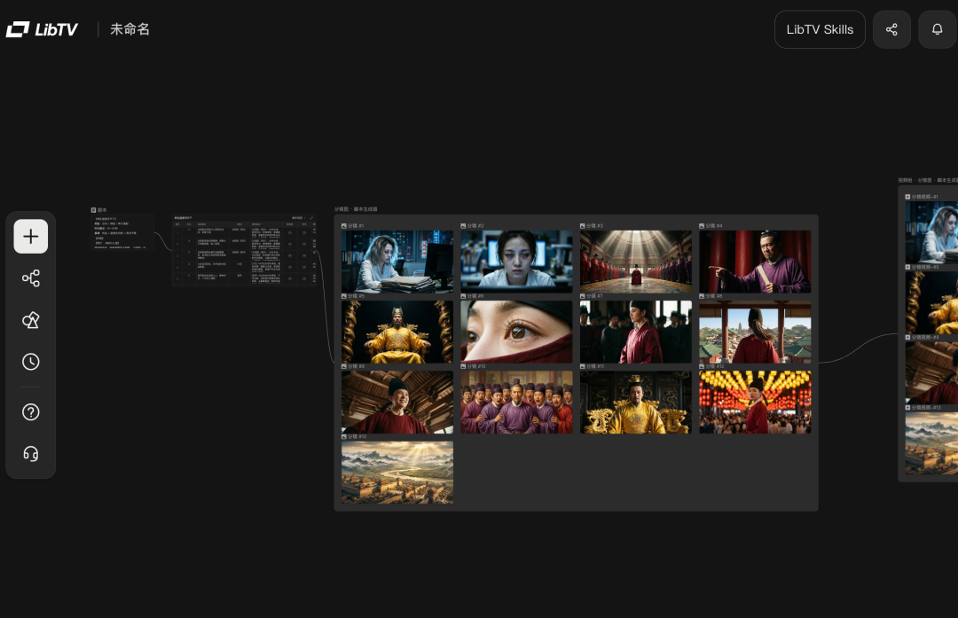 在 LibTV 里:画布上用文本模型写分场景脚本,9 宫格分镜一次出 9 张构图方案,挑一个方向。角色三视图把主角形象锁死,后面所有镜头基于同一个设定生成,不会再变脸。逐镜头生成视频,画布上直接剪辑配乐。一个界面,一个下午。做完了把这套工作流存成模板,下次换几个镜头描述重新跑就行。