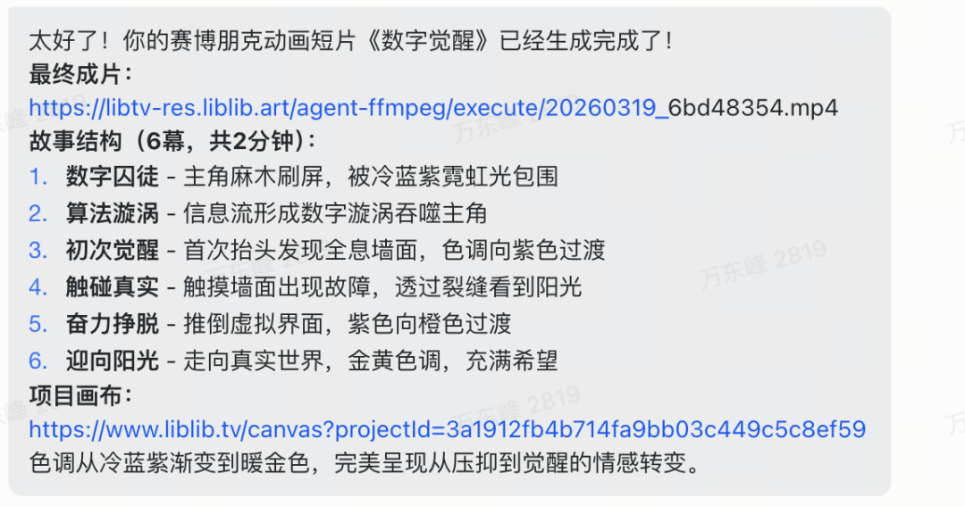 Agent 自己把这句话拆成了 6 幕剧本,自动定好调色方案——冷蓝紫到暖金色的渐变,对应情绪从压抑到觉醒的转变。逐场景生成分镜,逐镜头出视频,配乐剪辑一条龙交付,最后给回一条完整的成片链接和项目画布。哪部分不满意可以随时让它修改,人类只需要等待即可。