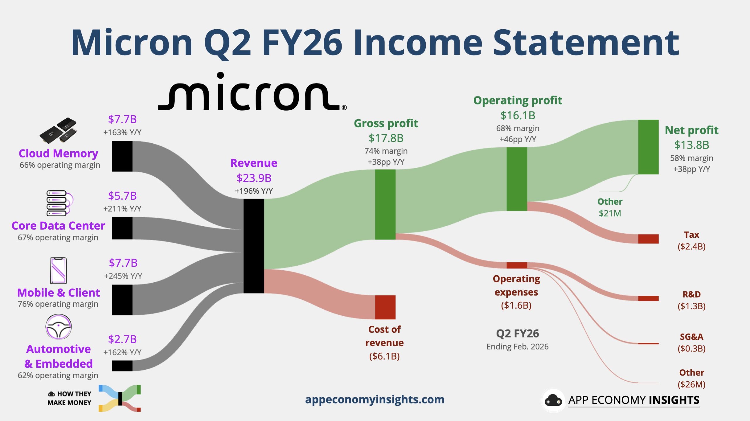 美东时间18日周三,美光公布,截至2月26日的公司2026财年第二财季,营收同比增长将近两倍至约239亿美元,非GAAP口径下调整后每股收益(EPS)12.20美元,均明显高于市场预期。美光称,本季在营收、毛利率、EPS与自由现金流等多项指标上均创单季最高纪录。