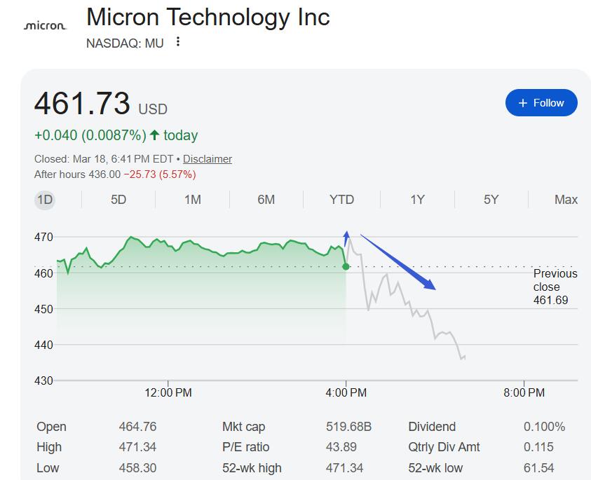 受强劲业绩与指引提振,财报发布后,周三几乎收平的美光股价盘后先快速拉升,一度涨超2%,但此后转跌,盘后跌幅一度达6%。