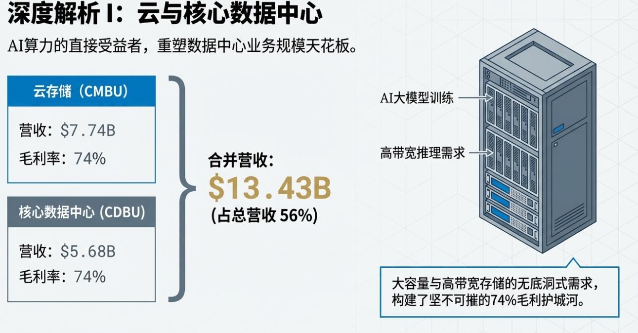 其中,云存储与核心数据中心合计营收约134.4亿美元,占总营收超过一半。