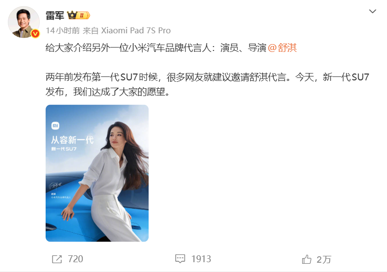 舒淇开 SU7:雷军官宣舒淇成为小米汽车品牌代言人,达成大家的愿望
