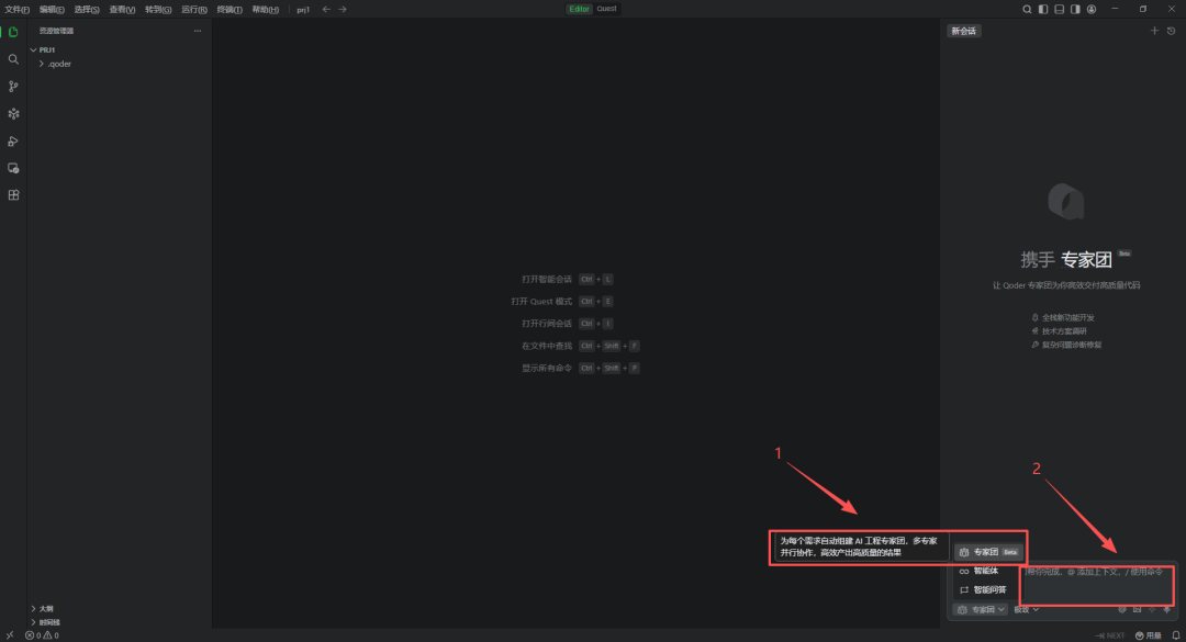 安装好 Qoder IDE 之后,新建一个工作目录,在右下角的 AI 对话面板中,点击模式选择器,切换到 Experts Mode 专家团模式,然后在对话框中输入你的需求即可。