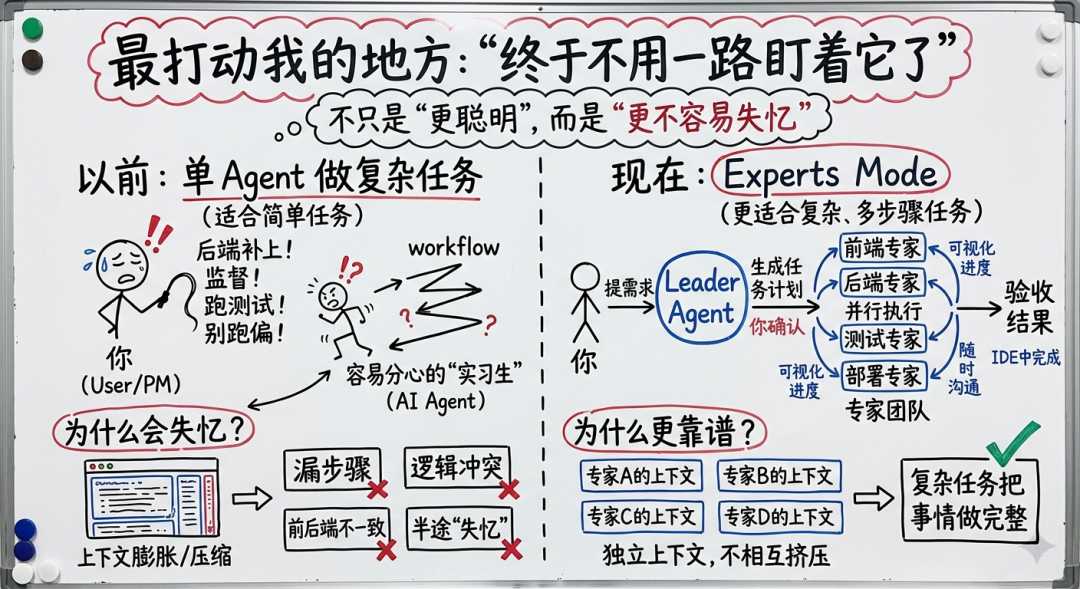 单 Agent 的问题就在这里。而 Experts Mode 通过让不同专家维护相对独立的上下文,避免相互挤压,因此在复杂任务下更容易把事情做完整。