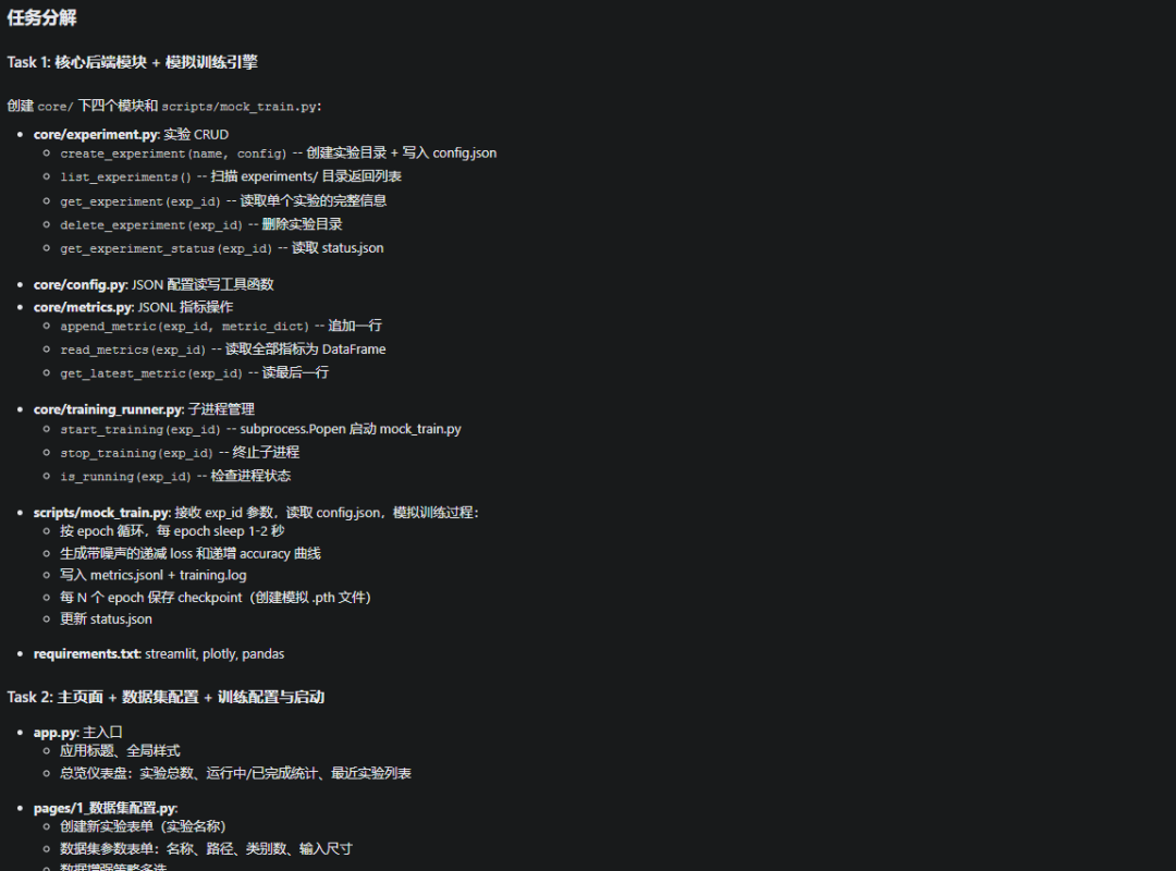 然后,任务 2:主页面 + 数据集配置 + 训练配置与启动分配给了前端工程师 Bill,任务 3: 实时训练监控页面分配给了前端工程师 Lee,任务 4: 模型权重管理 + 实验对比 + 结果导出分配给了前端工程师 Robin: